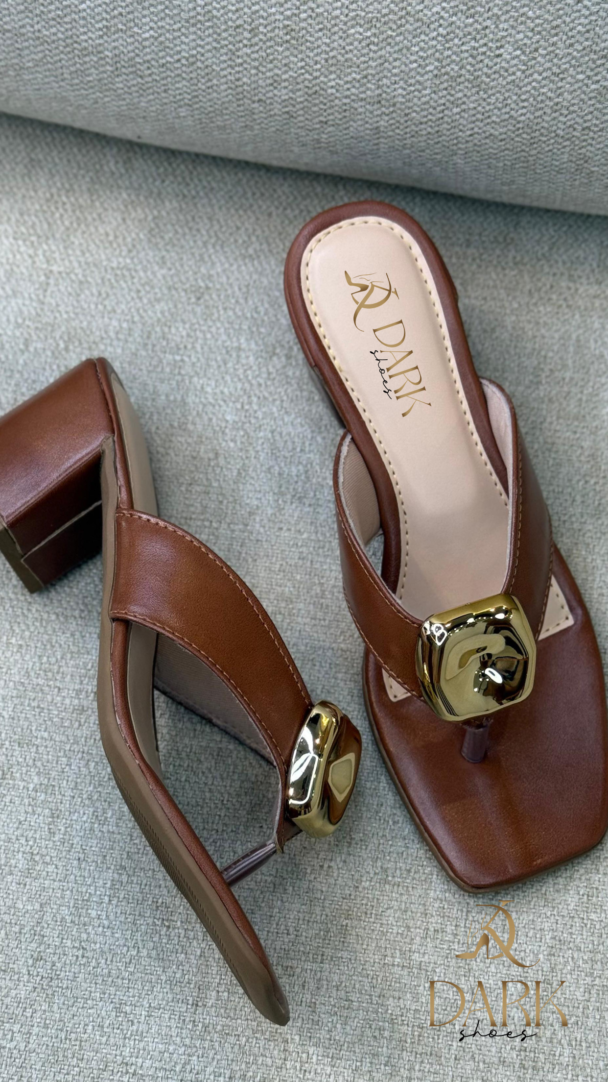 Tamanco salto bloco marrom com detalhe dourado. Elegância e modernidade